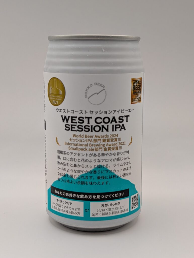 六甲ビールは初めてですが、この「WEST COAST SESSION IPA」は、World Beer Awards 2024セッションIPA部門銅賞、International Brewing Award 2021Smallpack ale部門金賞を受賞している有名なビールのようです。六甲ビールには他にも受賞ビールがあり、今回一緒に購入してますので、こちらはまたご紹介します。